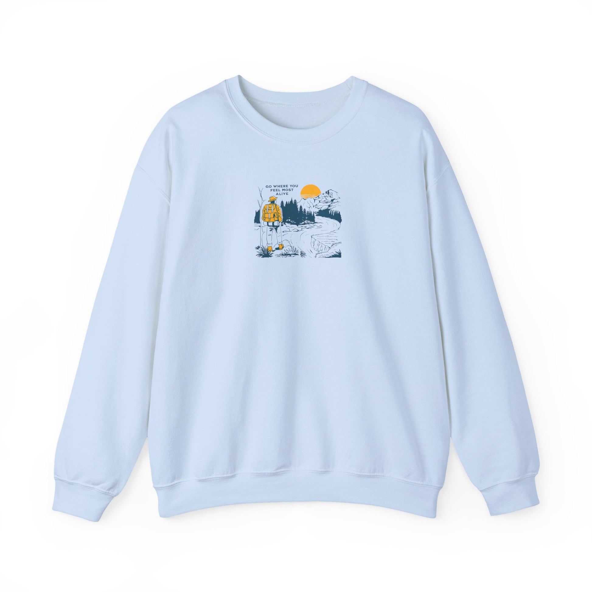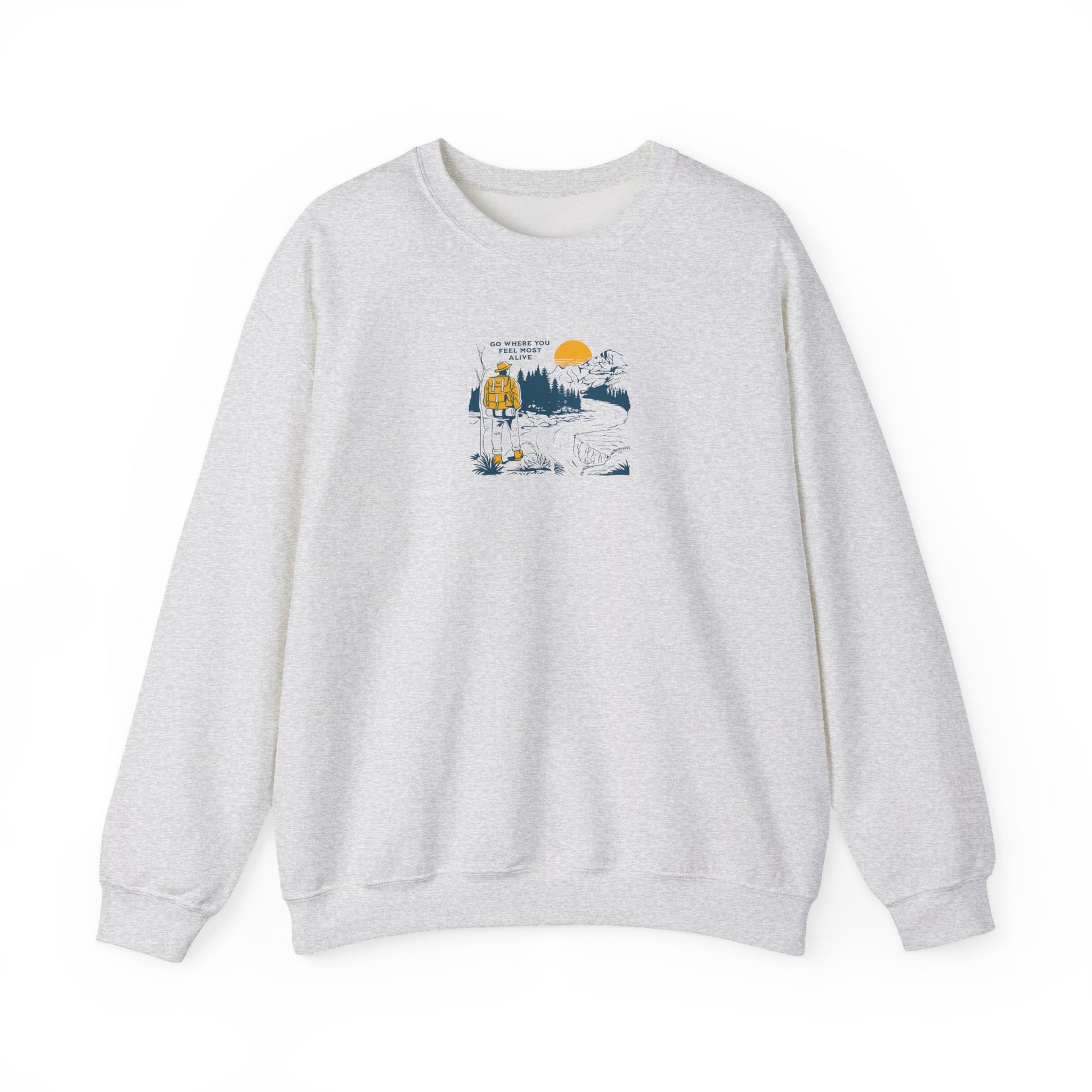 This cozy unisex crewneck features a vintage-style hiking scene with the quote “Go where you feel most alive.” Soft mid-weight fleece, durable print, and colors that pair with everyday outfits or trail days.
